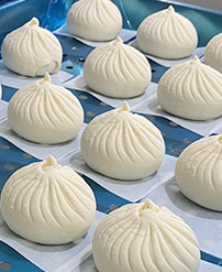 仿手工包子機采用仿手工搟面的方式將面皮壓成合適厚度。再由出餡部分將餡料填充至面皮上,經由卷面部分卷成圓柱形狀,傳送至成型部分成型,過程中不會破壞面皮筋性,保持手工原味。