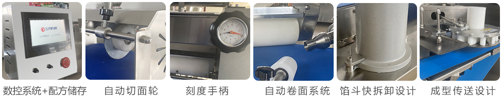 全機的工作部分主要由:送面系統、壓面系統、送餡系統、卷面系統、成型等五部分組成。