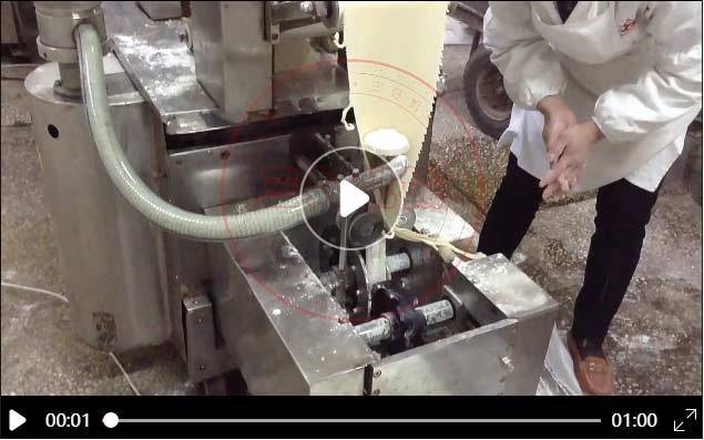 制作好面坯和拌好的餡料放入機器的餡斗和面斗,通過刻度手柄可以調節皮的厚薄,微電腦數控系統調節餡料多少,將面和餡傳送至成型機頭即可出餃子